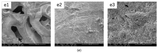 SEM images of (a) PTMG/PEG 100/0 (a1 200×, a2 1000×, a3 10000×); (b) PTMG/PEG 75/25 (b1 200×, b2 1000×, b3 10000×); (c) PTMG/PEG 50/50 ((c1) 200×, (c2) 1000×, (c3) 10000×); (d) PTMG/PEG 25/75 ((d1) 200×, (d2) 1000×, (d3) 10000×); (e) PTMG/PEG 0/100 ((e1) 200×, (e2) 1000×, (e3) 10000×) after 7 days of in vitro mineralization.