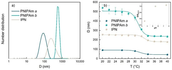 Dynamic light scattering measurements of PNIPAm a, PNIPAm b and IPN: (a) number distributions versus the hydrodynamic diameter measured at 20 °C; (b) hydrodynamic diameter versus temperature. In the inset in (b), ratio between the diameter at a given pH to the one at pH 5.5 as a function of pH. The concentration of the measured dispersions was 0.01 wt%.