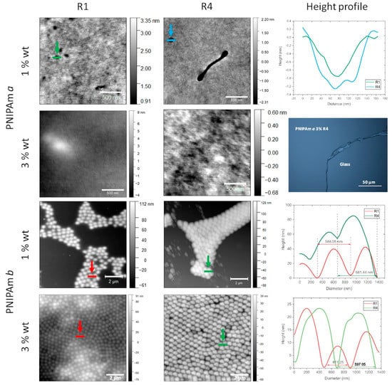 Firstly, we investigated the conditions under which continuous and uniform films can be obtained. In particular, we varied the dispersion concentration and spin-speed. In Figure 2, we show AFM images obtained for PNIPAm a and b spin-coated samples. Let us start with PNIPAm b, where the effects due to concentration and speed are particularly clear. For a concentration of 1% and speed R1, it is evident that a continuous film does not form but only isolated patches of aggregated particles. This result is in agreement with the ones previously reported by other groups for microgel with a size comparable to or larger than PNIPAm b [,]. It must be noticed that the spherical shape of the particles can be still observed. However as deduced from the height profiles, they are squeezed down. At the highest speed R4, the coverage is still not continuous but more compact aggregations form with some deformation of the particles, which do not have a spherical shape. For a concentration of 3%, a complete surface coverage can be observed at all speed values. These results suggest that the critical concentration in order to obtain full coverage for this PNIPAm size is between 1% and 3%.