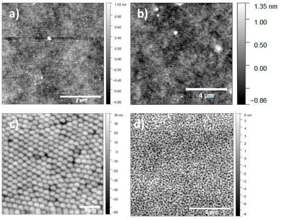 The contact angle in static conditions was measured using a Drop Shape Analysis System (DSA 30 Kruss Co., Hamburg, Germany). A water droplet of 5 µL was gradually engaged onto the surface. A polynomial function was fitted to the two 3-phase sections of the profile in the region of the baseline of the droplet []. The surfaces were blown with dry nitrogen before each measurement.