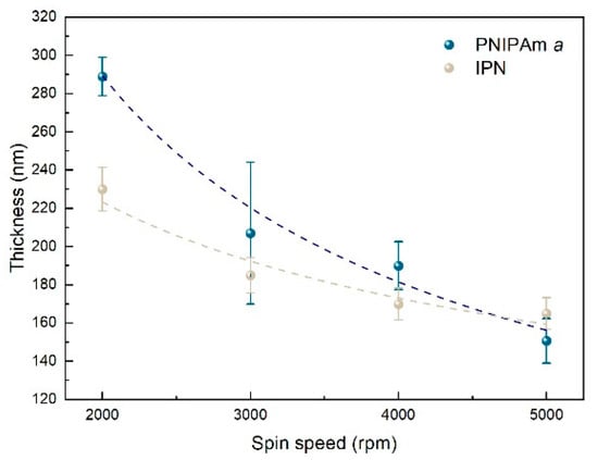 Thickness versus spin-speed for PNIPAm a and IPN films (concentration of 3 wt%) on glass-NaOH.