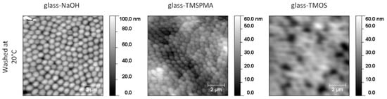 After washing at both 20 °C and 50 °C, PNIPAm b is still present on all the three different surfaces except on glass-NaOH after washing at 50 °C (Table 2). After washing at 20 °C the morphology seems to evolve in a different way depending on the substrate polarity (Figure 6). In particular, it is not affected on glass-NaOH, where it looks like an array of well distinct particles, and it evolves toward an almost continuous film with the particles that cannot be clearly distinguished in the most hydrophobic substrate (glass-TMOS). These results suggest that below LCST the adhesion between the particles and the substrates is always enough strong to avoid a complete detachment. However, it is not always so strong to prevent partial rearrangement of the particles or detachment at 50 °C. This hypothesis is corroborated by the morphology data obtained after washing at 50 °C, the temperature at which the particles are in their collapsed state and cannot easily rearrange (Figure S4). Comparing PNIPAm b with PNIPAm a (Table 1), the former seems to be more stable than the latter one, particularly on glass-TMSPMA and glass-TMOS at low temperature. This difference might be attributed to a larger contact area between the substrate and the particles in the case of the bulkier PNIPAm b leading to larger adhesion energy that has to be overcome for the detachment of each individual particle.