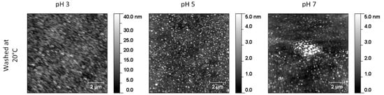 AFM images of IPN films spin-coated on glass-OH at 5000 rpm from a dispersion of 3 wt%, after being washed in water at 20 °C and pH equal to 3, 5, and 7.