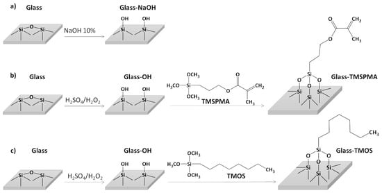 Schematic representation of the procedures employed in order to obtain (a) glass-NaOH, (b) glass-TMSPMA, and (c) glass-TMOS surfaces.