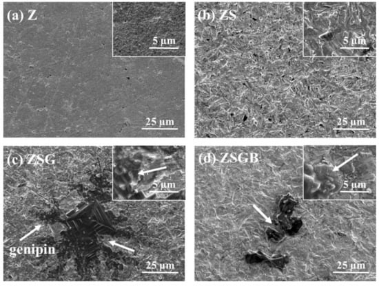 Figure 1 presents FESEM micrographs showing the surface morphology of Z, ZS, ZSG, and ZSGB. The ZSG specimens presented a snowflake-like pattern with a random distribution. The ZSGB specimens presented an irregular flake layer and the BMP-2 was mixed with the genipin. Several biomaterials have been used to mimic different biological microenvironments, such as genipin-crosslinked chitosan []. The immobilization of genipin to produce a biomolecular surface on Ti alloy has considerable potential for bone implant applications []. In this study, we immobilized the BMP-2 as an activator to improve bone cell responses, as will be discussed later.