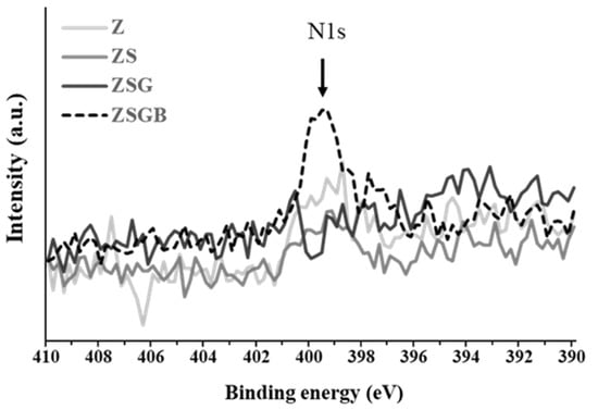 Figure 2 presents the XPS analysis results in terms of the N1s (1s orbital for nitrogen) spectra. According to the Thermo Scientific™ data system [], the binding energy of N1s of amine groups (-NH2) is around 399–400 eV. The N1s intensity of ZSGB (attributable to the N-terminal of BMP-2 proteins) was higher than that of ZSG, indicating the successful immobilization of BMP-2. Figure 3 presents the typical ATR-FTIR spectra of test specimens. The ZSGB specimens revealed the C=O stretching vibrations of amide I (1600–1690 cm−1), the C–N stretching and N–H bending vibrations of amide II (1480–1575 cm−1), and the N–H stretching vibrations of amide A and B (3050–3700 cm−1). This confirmed again the presence of BMP-2 in ZSGB specimens.