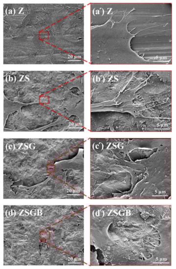FESEM micrographs showing the cell morphology on test specimens after 6 h of incubation: (a) Z (untreated zirconia), (b) ZS (sandblasted Z), (c) ZSG (genipin-treated ZS), and (d) ZSGB (BMP-2-immobilized ZSG); the micrographs (a’–d’) are partial enlarged views of the micrographs (a–d), respectively.