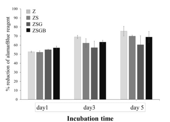 Human bone marrow mesenchymal stem cell (hMSCs) (passage 5–8) were seeded at a density of 1 × 104 cells/specimen on test specimens. Following incubation periods of 1, 3, and 5 d, the cell proliferation was evaluated by adding alamarBlue® reagent (Thermo Fisher Scientific, Waltham, MA, USA) to a final concentration of 10%, followed by incubation at 37 °C for 1, 3, and 5 d. The reducing environment of the cells in the alamarBlue assay was measured in terms of the conversion of resazurin (oxidized form) to resorufin (reduced form) and expressed as a percentage reduction in alamarBlue as a function of culture time.