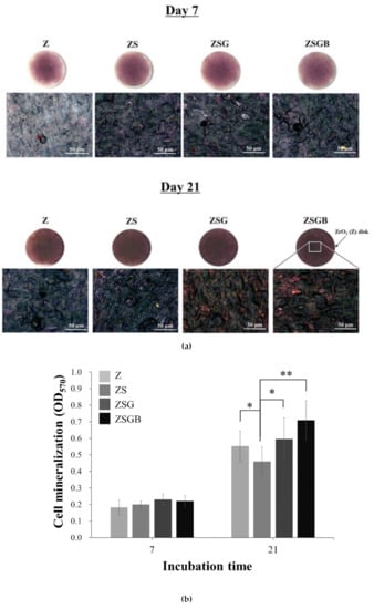 Cell mineralization analysis results, in terms of Alizarin red S staining, of the test specimens after 7 d and 21 d of incubation: (a) qualitative observation (upper row: zirconia disk; lower row: higher magnification of upper row); (b) quantitative analysis (* p < 0.05; ** p < 0.01).