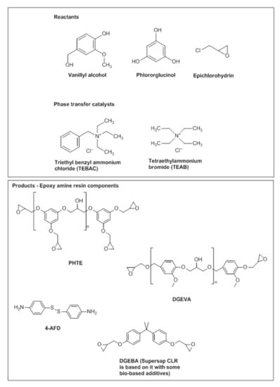Briefly, 4-aminophenyl disulfide (4-AFD) was purchased from Molekula (Rimini, Italy). Vanillyl alcohol (98%), phloroglucinol (99%), epichlorohydrine (99%), benzyltriethylammonium chloride (TEBAC, 99%), anhydrous sodium sulfate (Na2SO4, 99%), sodium hydroxide pellets (NaOH), and all used solvents (ethyl acetate, dichloromethane) (>95%) were purchased from Sigma Aldrich (Saint-Quentin Fallavier, France). Tetraethylammonium bromide (TEAB, 98%) was purchased from Alfa Aesar (Kandel, Germany). Supersap CLR epoxy resin system was purchased from Entropy Resins (Cupertino, CA, USA). All reagents, reactants and solvents were used as received (Figure 1).