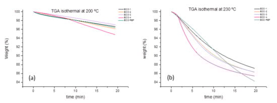 Weight-loss of the prepared samples during the TGA isothermal at: (a) 200 °C; and (b) 230 °C.