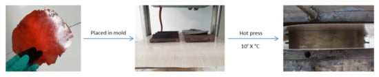 The same procedure (shown in Figure 4) was followed for all the samples: a zig-zag shaped mold and the hot-press were pre-heated to the required temperature (150 °C for ECO-1 and ECO-REF; 180 °C for ECO-2 and 200 °C for ECO-3). Once the entire system was tempered, a cured film of the corresponding formulation was placed in the mold in the hot press. Heat and pressure (100 bar) were applied for 10 min so the material has enough time to adapt to the new shape. The mold was let to cool down to room temperature, closed but unloaded.