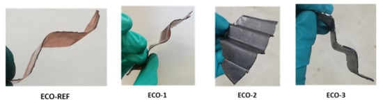 Recycled materials after 10′ at: 150 °C (ECO-1); 180 °C (ECO-2), and 200 °C (ECO-3).
