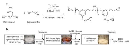 Phloroglucinol (50.0 g, 0.4 mol, 1 eq), epichlorohydrin (550.2 g, 5.95 mol, 15 eq), and tetraethylammonium bromide (TEAB, 62.5 g, 0.3 mol, 0.75 eq) were mixed in a 1 L three-necked reactor equipped with a thermometer, mechanical stirrer, and a condenser. The reaction mixture was stirred vigorously at 70 °C for 16 h. Then, the mixture was cooled down at room temperature and poured in dichloromethane (800 mL). The organic layer was washed three times with deionized water, dried on anhydrous Na2SO4, filtered, and concentrated on rotary evaporator. A red viscous liquid (116.6 g, 1.2 eq of chlorohydrin) was obtained and used in the second step without any further treatment. The red viscous liquid was solubilized in dichloromethane (1000 mL) and TEAB (4.17 g) was added to the mixture. Then, a NaOH solution (22 wt%, 1.4 eq. compared to residual chlorohydrin) was added dropwise for 30 min with continuous stirring. The reaction was carried out at room temperature for 3 h. Afterwards the mixture was washed three times with 200 mL of distilled water. The organic layer was dried on anhydrous Na2SO4 for 12 h and filtered. The excess solvents were removed under reduced pressure at 60 °C with a rotary evaporator. PHTE(batch number SP-9S-5-003) was obtained as a pale-yellow viscous liquid (111 g) with a yield of 95% and the product was characterized by 1H NMR. Determination of the epoxy value was carried out by 1H qNMR. The epoxy index was evaluated at 6.78 meq·g−1 and the average-number of repeating units was estimated here at n = 0.15. Theoretical value in this case was 10.2 meq·g−1. Deviations between theoretical and experimental epoxy values were explained in a previous paper []. Corresponding molecular weight: 330.0 g·mol−1. The viscosity of PHTE resin was measured at various temperatures (20 °C: 130 000 cP; 50 °C: 3 000 cP and 80 °C: 300 cP).