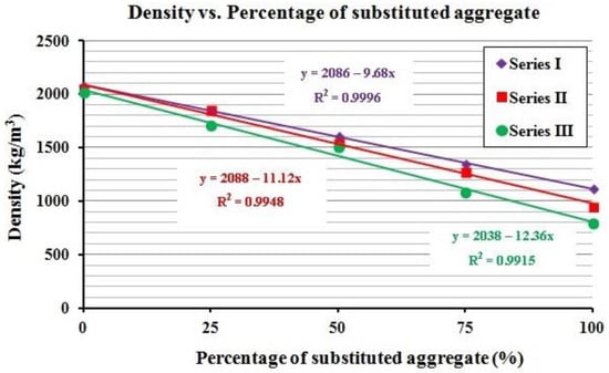 Additionally, the scatter plot of the density vs. the percentage of substituted aggregate was created for each series to analyze the curves that best correlate both variables for each series (Figure 1). A linear relationship was established for all the series, with determination coefficients over 0.99, implying that more than 99% of the variability of the variable can be explained by the models [,,,]. Moreover, the coefficients of the independent variable (the percentage of substituted aggregates) showed that for each 10% of aggregate replacement, the density decreases between 96.8 to 123.6 kg/m3, depending on the mortar series.