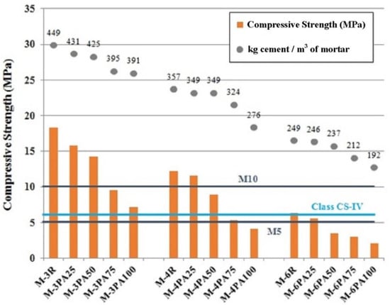 In Figure 2, it can be observed the compressive strength at 28 days of the mortars with the employed quantity of cement in each denomination.