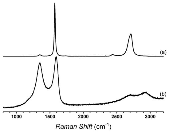 Figure 1 shows the Raman spectra of graphite and TrGO samples. Spectrum (a) of Figure 1 corresponds to the Raman spectrum of graphite in which the graphitic band (G band), corresponding to the first order vibration mode of E2g phonon of the sp2 carbon atoms, appears at 1590 cm−1. Additionally, a very small D band is observed at 1350 cm−1, which is typically associated to the breathing modes of aromatic carbon rings. This band is attributed to the edge defect and functional groups present in the lattice of graphene materials [,]. The 2D band, which is the overtone of D bands is seen ca. 2700 cm−1, while the overtone of D and D’ bands, the so-called D+D’ band, appears at 2920 cm−1 []. Spectrum (b) of Figure 1 shows a small D band at 1350 cm−1 and the G band at 1572 cm−1 of TrGO. A drastic intensity decrease of the 2D band at 2710 cm−1 was observed. This could be attributed to the order loss and increase of defects, which inhibited the overtone occurrence. Another important change is related to the drastic increase of the D band, which usually is associated to the increase of edge defects vacancies and distortions as well as the functionalities in graphene lattice. The ratio of the intensity of the G to D bands (ID/IG) gives an indication of the degree of defects in the graphene structure. The intensity ratio of D to G bands (ID/IG) for graphite is 0.03 (Figure 1a), while for TrGO, it is 0.89 (Figure 1b). This fact indicates the drastic increase of the defects of the graphene lattice as a consequence of the consecutive oxidation and reduction processes in which the graphite is subjected in order to obtain TrGO [].