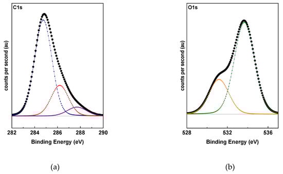 Figure 3 presents the photoelectric lines C 1s (Figure 3a) and O 1s (Figure 3b) of TrGO. The functional groups contributions were estimated by using curve fitting, which based on a Shirley baseline and Lorentz model. The assignments of these functional groups are presented in Table 1. The O/C ratio evidenced the low content of oxygen atoms in TrGO, indicating that the thermal process favors the elimination of oxygenated functional groups. The contribution observed at 286.2 eV corresponds to carbonyl groups (Figure 1a), while that observed at 287.5 eV corresponds to the contribution of alcohol and the ether functional groups present in the graphene structure. The latter is the dominant contribution of the oxygenated functional groups. Similarly, in an O 1s photoelectric line, the dominant contribution observed at 533.7 eV (Figure 1b) corresponds to alcohol and ether functional groups. The lower contribution observed at 531.3 eV is associated with ketone groups. Although the TrGO possesses a higher content of C=C and C-C bonds that have a nonpolar character, the presence of oxygenated functional groups such as ether, alcohol, or ketone, suggests a partial affinity of TrGO with polar polymers such as PVA.