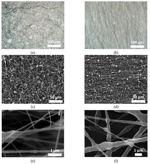 Figure 4 shows optical (a,b) and scanning electron microscopy (c-f) images of random (c) and aligned (d,e) EM4 and aligned EM3 (f). Figure 4a,b shows the optical images of general fiber orientations of EM4, and Figure 4c,d shows SEM images of random and aligned composite EM4 fibers showing the presence of beads. Meanwhile, Figure 4e,f shows EM4 and EM3 with aligned fibers obtained in the presence and absence of TrGO as a NIR-active thermal inducer. Figure 4e shows EM4 fibers composed of PVA, NR, and GA polymers which presented fibers with more homogeneous surface roughness than EM3 and smaller fiber diameters ranging from ≈80 nm to ≈300 nm. The presence of TrGO in this EM can be identified as dark areas that can be transversely and longitudinally distinguished along the composite aligned fibers and highlighted by the white circles in Figure 4e. At the same time, Figure 4f shows EM3 fibers composed of PVA, NR, and GA but without TrGO, as demonstrated by the absence of TrGO in the composite fibers.