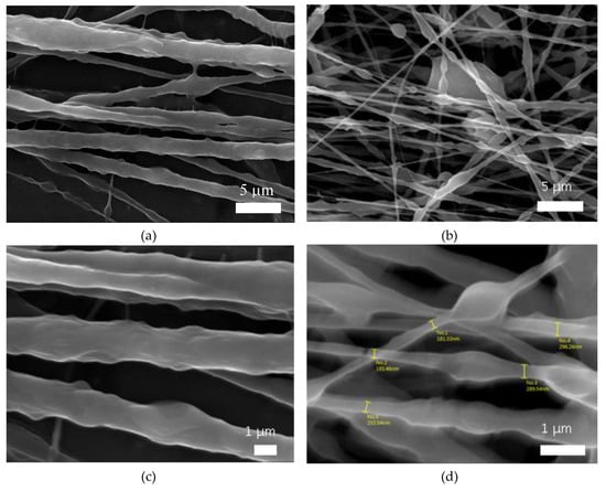 Moreover, Figure 5 shows the morphology of EM2 with aligned fibers containing PVA, NR, and SDS utilized as surfactant as in EM3 and EM4, in the absence (a,c) and in the presence of TrGO (b,d). Figure 5a,c shows polymer composite fibers with rougher surface and wider diameters ranging from ≈1 to 2 µm. In general, fibers of EM2 without beads were found. However, when the EM2 fibers were prepared in the presence of TrGO (Figure 5b,d), fibers with smoother surface and narrower diameters ranging from 180 to 300 nm were obtained. In Figure 5d, the presence of TrGO can be identified as dark areas along this composite polymer fiber, as was also shown by the white circles in Figure 4e for EM4.