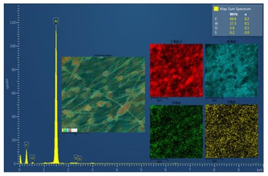 SEM-EDS of aligned EM4. The elements of carbon (C), aluminum (Al), oxygen (O), and sulfur (S) are designated with the colors red, light blue, green, and yellow, respectively.