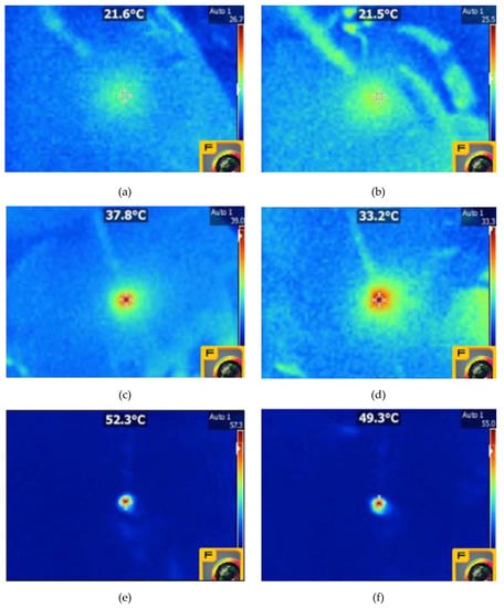 Infrared thermography of EM3 with random and aligned fibers and EM4 with 0.5% and 1% TrGO registered at 10 V and 2 cm: (a) EM3 with random fibers, (b) EM3 with aligned fibers, (c) EM4 with random fibers (0.5% TrGO), (d) EM4 with aligned fibers (0.5% TrGO), (e) EM4 with random fibers orientation (1% TrGO), and (f) EM4 with aligned fibers (1% TrGO).