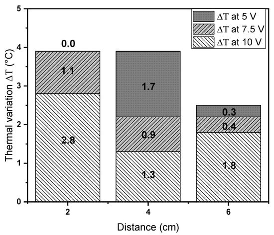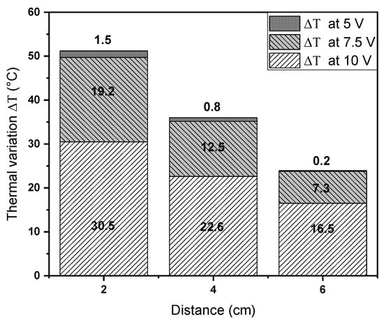 Additionally, Figure 9 shows the behavior of the ΔT obtained between the EM3 and EM4 considering only random fibers orientation with respect to the applied electric potential and distance. Our results showed that there was a decrease in ΔT as the irradiation was carried out at a greater distance with higher electric potential, which implies that the greater ΔT difference was due to the increase in the conversion of optical to thermal energy by TrGO in the EM4 at the highest electric potential. Furthermore, at different distances, a decrease in ΔT was observed, as the applied electric potential was lower.