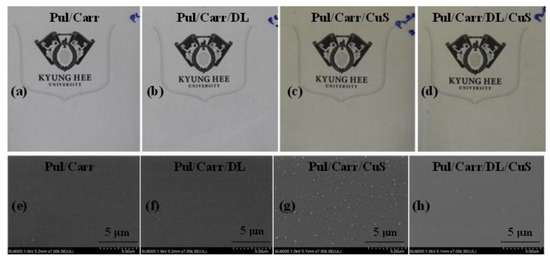 The macroscopic appearance of all the prepared films is displayed in Figure 1a–d. The Pul/Carr and Pul/Carr/DL films were transparent without color, but the CuSNP-added films were greenish. The films’ morphology was observed by the FESEM (Figure 1e–h), and it shows all the films were intact and without any apparent defects. The blending of carrageenan in pullulan makes a uniformly distributed homogenous and compatible film. The fillers were also evenly mixed in the matrix polymer, indicating their good miscibility in the liquid phase. In addition, there were no cracks or voids in the surface image and no apparent accumulation of particles, indicating both CuSNP and DL are compatible with the polymer matrix. The excellent compatibility was due to the strong adhesion, intermolecular binding, and affinity between the fillers and the matrix polymer.