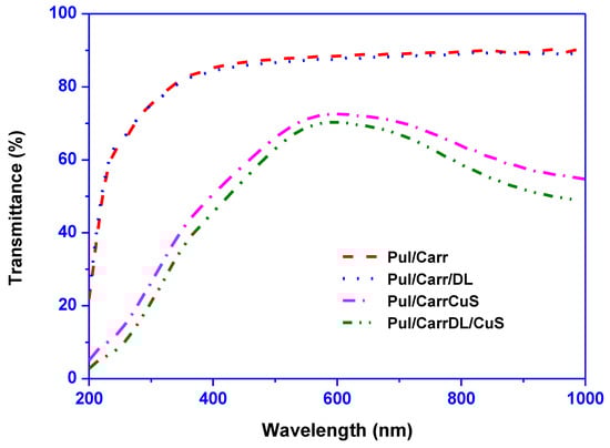 UV-visible transmission spectra determined the film’s optical properties, and the results are displayed in Figure 2. The UV-vis spectra exhibit that the Pul/Carr and Pul/Carr/DL films were transparent. On the other hand, the CuSNP-added (alone or combined) composite film’s absorption profile was completely different due to the near-infrared absorption of CuSNP [15]. For further understanding, the film’s UV-light barrier and transparency were scrutinized by measuring the absorbance at 280 nm and 660 nm, respectively, and the results are displayed in Table 1. The UV light transmittance and transparency of the control film were 70.1% and 88.3%, respectively. The addition of DL did not much influence the optical properties but was greatly affected by the incorporation of CuSNP. The UV-light barrier property was increased ~75%, which is very significant, whereas the transparency remains ~70%, which is suitable for packaging application. The substantial increase in UV-light barrier property was due to the UV-light absorption of CuSNP [25]. CuSNP and DL’s present findings on Pull/Carr films’ color properties are consistent with the previously published results [16,26]. Therefore, the current finding suggested that the blending of CuSNP/DL improved the UV-light barrier properties of the film without greatly affecting the transparency.