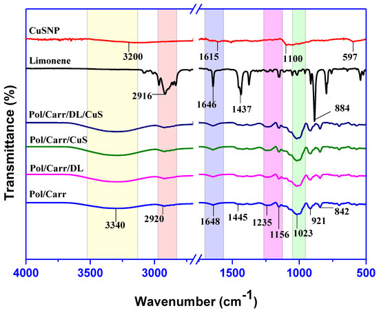 FTIR spectra of CuSNP, DL, and pullulan/carrageenan-based films.