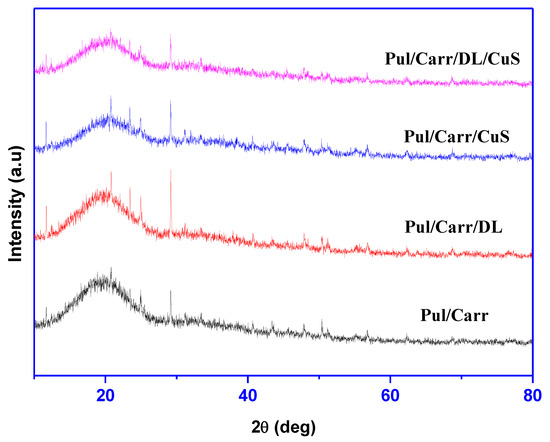 The XRD pattern of the Pul/Carr-based films are presented in Figure 4. All the tested films showed a characteristic broad peak ~20° and some unknown peaks, which is presumably due to the amorphous nature of the biopolymers (pullulan and carrageenan). Except for some slight alteration, the XRD data of the Pul/Carr-based composite films do not show any clear change in peak pattern after the addition of DL and CuSNP. Although CuSNP show characteristic XRD patterns [25], they did not appear in the present findings as only 0.5% of CuSNP was used.