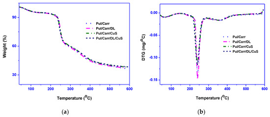 The thermal stability (TGA/DTG) of the films are shown in Figure 5. During thermal decomposition, all the film showed a multi-step weight loss. The first weight loss occurred at 50−115 °C, mostly due to the film’s humidity. The second and main weight loss was observed at 160−280 °C with a maximum of around 240 °C due to glycerol and biopolymer degradation [38]. The final stage of weight loss occurred at 290−410 °C due to the remaining biopolymers’ decomposition [37,41]. The decomposition temperatures (onset/endset), 50% decomposition temperature (T0.5), and the films’ char content are shown in Table 3. The T0.5 of the CuSNP added film was increased ~10 °C, whereas it remains unchanged for DL. The maximum decomposition temperature of the film was not affected by the presence of fillers. Similar thermal stability results were reported in the case of DL-added PLA, and CuSNP-added alginate film previously [16,26]. TGA test results designated that the incorporation of fillers does not alter the Pul/carr-based film’s thermal stability. The char content at 600 °C for the film was varied in the range of 36–38% depending on the type of filler, and the relatively high char content of the films was due to the non-ignitable minerals present in the biopolymer [38].