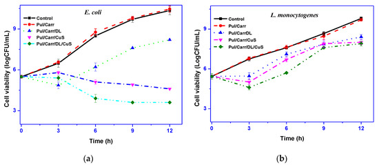 The antimicrobial activity of all the film samples is presented in Figure 6. The control and neat polymer film do not display any antimicrobial activity against tested bacteria, whereas the films comprising CuSNP and DL showed some antibacterial activity against tested strains. The antibacterial activity of CuSNP was more effective compared to DL. However, the composite film containing the combined filler displayed a superficial bactericidal effect. It was observed that the activity of CuSNP is more comprehensive and showed a significant reduction in the growth of E. coli (about 7 log cycles) after culturing for 12 h compared to the control, whereas, in the case of L. monocytogenes, a slight decrease in growth witnessed (about two log cycles). The variation of antimicrobial activity against E. coli and L. monocytogenes was most probably due to the cell wall structure’s difference. The obtained results suggested that DL showed some antibacterial activity against E. coli, but CuSNP exhibited efficient antibacterial activity against E. coli and some activity against L. monocytogenes. It is previously reported that the CuSNP showed antibacterial activity only at higher content (2%), and in this work, as only 0.5% of CuSNP was used, intense antibacterial action was not observed. Like the current findings, the potent antimicrobial activity of CuSNP-loaded agar, alginate, and carrageenan composite film was reported previously [15,16,25]. The antibacterial activity of CuSNP was not exactly elucidated yet but believed to damage the cell membrane and oxidative damage through the formation of reactive oxygen species [42]. The DL-containing film’s antimicrobial activity was comparatively lower than predictable; however, a similar low antimicrobial activity has been reported previously [22]. In the case of DL, the antibacterial activity is dependent on the content and also on the microbial strain [28]. The antibacterial mechanism of DL relies on the ability to penetrate through the microorganism’s cell wall, which disturbs the cell viability [22]. Overall, the Pul/Carr-based film with moderate antimicrobial action can delay the growth of the microorganism.