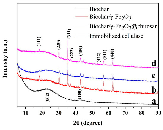 The X-ray diffraction (XRD) patterns of biochar (a, black curve), biochar/γ-Fe2O3 (b, red curve), biochar/γ-Fe2O3@chitosan (c, blue curve), and immobilized cellulase (d, pink curve).