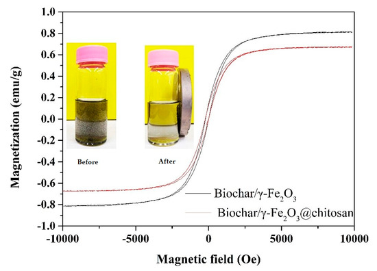 Figure 3 shows the magnetization curves of the biochar/γ-Fe2O3 and biochar/γ-Fe2O3@chitosan at room temperature. It can be seen that the saturation magnetization of the biochar/γ-Fe2O3 was 0.81 emu/g. However, the saturation magnetization of the biochar/γ-Fe2O3@chitosan decreased to 0.67 emu/g. This could have been caused by the coating of non-magnetic chitosan on the surface of the biochar/γ-Fe2O3 and the weight conversion of the coating. It can be clearly seen from the photos in Figure 3 that most of the biochar/γ-Fe2O3@chitosan could be easily recovered by a magnet.