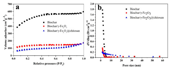 Figure 4 shows the N2 adsorption–desorption isotherm (Figure 4a) and the pore size distribution (Figure 4b) of the porous biochar, biochar/γ-Fe2O3, and biochar/γ-Fe2O3@chitosan using the BJH method. The nitrogen adsorption–desorption isotherms of the samples exhibit a combination of type I and IV shapes according to the IUPAC classification, which explains that the samples contain both micropores and mesopores [39]. However, the N2 adsorption capacity of the biochar decreased after modification with γ-Fe2O3 and chitosan. The average pore size, BET surface area, and total pore volume of the porous biochar, biochar/γ-Fe2O3, and biochar/γ-Fe2O3@chitosan are given in Table 1. After modification of the magnetic base material and chitosan, the BET surface area of the support reduced from 1595.7 to 271.6 m2 g−1. This is because, during the process of modifying the support, the modification coated the surface of the porous biochar and the inner wall of the pores, thereby blocking a part of the mesopores of the biochar. After modification, the average pore size of the sample increased. This is because the iron ions adhered to the biochar and then the magnetic iron oxide crystals grew after calcination. During this process, some of the small pores were blocked, so the average pore size of the biochar/γ-Fe2O3 became larger than that of the biochar. After chitosan modification, flocculent chitosan covered the surface of the sample, causing some of the small pores to become blocked, leading to an increase in the average pore size.