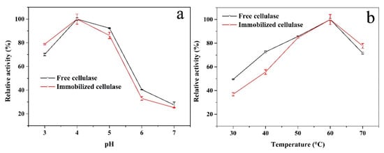 Influences of (a) pH and (b) temperature on the relative activity of the free (black curve) and immobilized (red curve) cellulase.