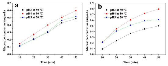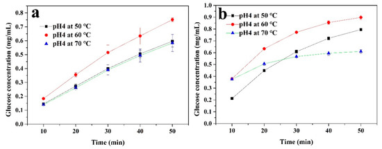 In order to further investigate the factors affecting the cellulase activity, the immobilized and free enzymes were used to hydrolyze a 1% CMC solution for 50 min at 50 °C with different pH levels (3, 4, and 5), as well as at pH4 with different temperatures (50, 60, and 70 °C). The concentration of glucose in the supernatant was measured every 10 min. As shown in Figure 7, both the immobilized and free cellulase had the highest concentrations of glucose at pH 4. The glucose produced by the free enzyme hydrolysis of CMC was higher than that of the immobilized enzyme. However, the change in pH had a greater impact on the free enzyme’s hydrolysis process of CMC. Moreover, the inhibitory effect on enzyme activity was more obvious at pH 3. The immobilized enzyme showed a relatively stable state under these conditions, which could be attributed to the covalent bonds and the CS layer, confirming the above analysis. Figure 8 shows the effect of temperature on the hydrolysis process. As the temperature increased (from 50 to 70 °C), the diffusion coefficient of CMC became stronger and it was easier for the CMC to diffuse into the active sites of the enzyme. For the free enzyme (Figure 8b), the concentration of glucose showed a higher level at 60 and 70 °C during the initial hydrolysis. However, this enzyme may denature and its original structure could be destroyed at an excessively high temperature, which would inhibit the enzyme activity. This is why the growth rate of the glucose concentration quickly returned to being flat at 70 °C. In Figure 8a, compared to the free enzyme, the glucose amount of the immobilized cellulase increased steadily during the 50-min continuous reaction. This is because this enzyme is less susceptible to temperature-induced conformational changes after covalent immobilization [49], meaning that cellulase can maintain its structure during the hydrolysis process.