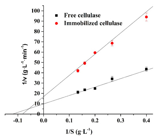 The Michaelis–Menten constant (Km) and maximum reaction velocity (Vmax) of enzymes are important kinetic parameters for determining the tightness of a substrate and enzyme binding and the speed of the enzymatic reaction. The Km and Vmax were determined by Lineweaver–Burk plots shown in Figure 9 and Table 2. The Km value of the free and immobilized cellulase was 8.298 and 12.134 g L−1, while their Vmax values were 0.102 and 0.059 g L−1 min−1, respectively. The increase in Km and the decrease in Vmax indicates that the binding tightness between the immobilized enzyme and substrate decreased compared to that of the free enzyme. This is because of the steric hindrance generated by the support [45].