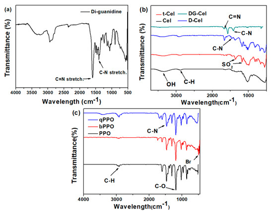 Figure 1 illustrates the FTIR spectra of DG, Cel, and PPO. A strong absorption band at 1610 cm−1 corresponding C=N stretching vibration and a band 1400 cm−1 for C–N stretching were observed in the FTIR of DG (Figure 1a) as reported previously [53] The FTIR spectra of cellulose, tosylated cellulose, and quaternized cellulose are shown in Figure 1b, revealing that the -OH stretching band of pristine cellulose diminished in intensity after tosylation reaction. Moreover, asymmetric stretching at 1355 cm−1, and symmetric stretching at 1177 cm−1, were observed in the FTIR spectra of tosylated cellulose, which confirmed the tosylation reaction. After the quaternization reaction, the stretching band diminished and a band located at 1431 cm−1 indicated substitution of the tosyl group by DABCO [18]. Similarly, DG-Cel showed the stretching band corresponding to the DG at 1610 cm−1 for the C=N stretching, confirming the quaternization reaction [54]. As shown in Figure 1c, the characteristics of the stretching band for PPO were observed at 2923 (aromatic C–H stretching), 1469, and 1600 (aromatic ring stretching), and 1182 cm−1 (aromatic C–O stretching) [25]. The bromination of PPO was confirmed by the C-Br stretching band at 500 cm−1 in the FTIR spectra of bPPO (Figure 1c) [51]. The C-Br stretching band diminished after quaternization, and, additionally, the C-N stretching band at 1431 cm−1 appeared in the FTIR of qPPO, confirming the quaternization of bPPO [51].