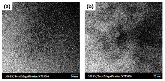 The structure of the membranes was further characterized by TEM as shown in Figure 3. The dark regions in the TEM image correspond to the hydrophilic domain, whereas the bright region represents the hydrophobic part [25,58,59]. The distribution of the darker regions in qPPO/DG-Cel7 (Figure 3b) is more distinct and evenly spread than in qPPO/D-Cel7 (Figure 3a), demonstrating better phase segregation in the former. Furthermore, the AFM images of qPPO/D-Cel7 and qPPO/DG-Cel7 (Supplementary Figure S3) display a distinct morphology. Previous reports indicated that the bright and dark region in the AFM images corresponds to the hydrophobic and hydrophilic domain, respectively [25]. As can be seen from Supplementary Figure S3, the hydrophilic domains in the composite membranes were uniformly distributed throughout. This stems out from the good interaction between the filler surface and the polymer backbone [18]. Thus, it can be stated that phase segregation existed at the nanoscale that might benefit the movement of the ions [25].