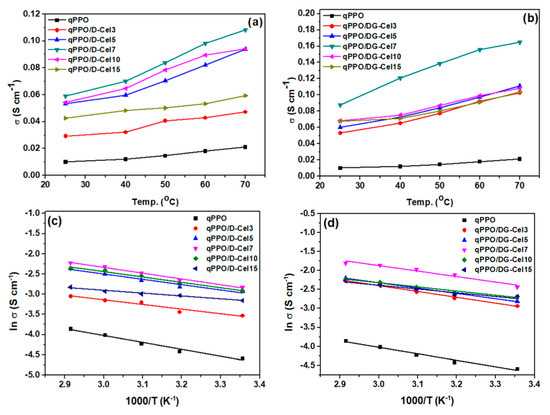 Ionic conductivity vs. temperature of (a) qPPO/D-Cel and (b) qPPO/DG-Cel membranes and Arrhenius plot of (c) qPPO/D-Cel and (d) qPPO/DG-Cel membranes.
