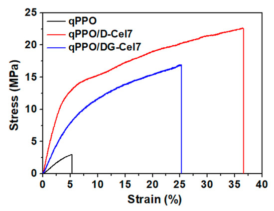 The tensile properties of the composite membranes in the wet state were measured and compared as shown in the stress-strain curves (Figure 5). For comparison, the tensile strengths of qPPO and qPPO/D-Cel7 and qPPO/DG-Cel7 have also been presented. In the wet state, qPPO displayed a tensile strength of 3.03 MPa, whereas qPPO/D-Cel7 and qPPO/DG-Cel7 exhibited 22.68 and 16.96 MPa, respectively. A higher degree of cross-linking of qPPO/D-Cel than qPPO/DG-Cel membranes offers more resistance to chain slippage, thus requiring higher energy for breakage, as observed previously [4,68]. Moreover, the fillers with a high surface area enhance the interfacial interaction with the matrix, thereby limiting chain slippage [65]. Furthermore, the TGA measurements indicated that the composite membranes also showed better thermal stability than the pristine qPPO membrane. The weight loss occurred at 200–375 °C, which was attributed to the degradation of the cationic groups in the polymer chain, decreased by the presence of cellulose fillers as presented in Supplementary Figure S5.