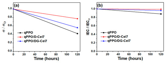 Figure 6 shows the alkaline stabilities of the membrane samples, which were estimated by observing the variations in their ionic conductivity and IEC in KOH (1 mol L−1) at 60 °C for 120 h. As shown in Figure 6a, the ionic conductivity of the pristine qPPO decreases by 58% after 120 h; on the other hand, qPPO/D-Cel7 and qPPO/DG-Cel7 decreases by 23% and 44%, respectively, of the initial value. The variations in IEC also showed a similar trend; qPPO, qPPO/D-Cel7, and qPPO/DG-Cel7 retained 88%, 99%, and 96% of the original IEC value after 120 h (Figure 6b). Thus, the composite membranes with quaternized cellulose are observed to maintain better stability than the pristine qPPO at 60 °C. Among the membranes, qPPO/D-Cel7 exhibited better alkaline stability, because of the electron pair sharing between the two nitrogen atoms inside the DABCO molecule [69]. Additionally, highly cross-linked membranes have been demonstrated to be much more stable under alkaline conditions [20,21]. Table 1 shows that the qPPO/D-Cel7 membrane has a lower WU and higher GF than qPPO/DG-Cel7, which can be considered less vulnerable to degradation because the former is denser and more cross-linked than the latter.