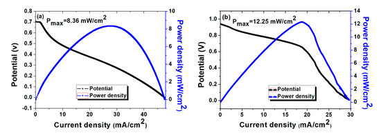 The applications of the synthesized composite AEMs in a urea/O2 fuel cell were evaluated using urea (0.33 mol L−1) in aqueous KOH solution (3 mol L−1) as anolyte and moisturized O2 as the catholyte. The experimental setup and fuel conditions were chosen based on previous reports from our laboratory [25]. A urea/O2 fuel cell with qPPO/D-Cel7 as an AEM showed an open-circuit voltage (OCV) of 0.71 V at 70 °C, and exhibited a maximum power density of 8.36 mW cm-2 at a current density of 27.44 mA cm−2 at 70 °C (Figure 7a). Meanwhile, the cell using qPPO/DG-Cel7 showed a higher OCV of 0.94 V than the qPPO/D-Cel7 due to reduced ohmic loss mainly caused by the high ionic conductivity [70,71], while a maximum power density of 12.25 mW cm−2 at a current density of 18.81 mA cm−2 was obtained at 70 °C (Figure 7b). The power density achieved in this study is observed to be higher than those reported by similar investigations on direct urea fuel cells (DUFCs) (Supplementary Table S4). Thus, the present study demonstrated that by using a suitable AEM, the performance of DUFCs can be enhanced under alkaline conditions. The current membranes can be further evaluated using a suitable high-performance catalytic system in the DUFCs.