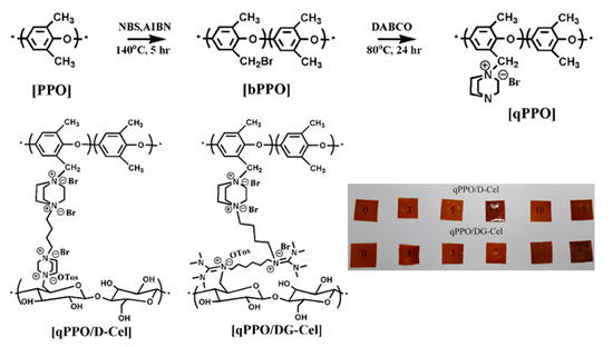 Firstly, the brominated PPO was prepared using a slightly modified version of a previous reported method [51]; briefly, PPO (6 g) was completely dissolved in chlorobenzene (60 mL) under vigorous stirring, and the temperature was slowly raised to 140 °C. Afterward, AIBN (0.25 g) followed by NBS (4.45 g) were added to the above solution and stirred for 5 h in an inert atmosphere. Then, the reaction mixture was precipitated and washed by pouring into a 10-fold excess of methanol. The dark precipitate was dissolved in chloroform and reprecipitated in methanol. This was again washed repeatedly with methanol and dried overnight in a vacuum oven at 45 °C to obtain brominated PPO (bPPO).