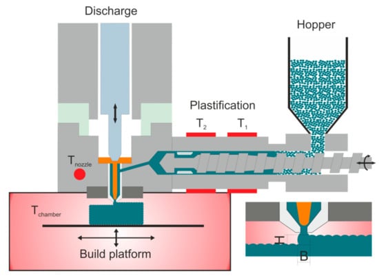 A brief description of the APF processing parameters is given here. The position of the different heated zones (T1, T2, Tnozzle and Tchamber) is shown schematically in Figure 1. Dosing stroke, similar to injection molding, is the distance that the screw travels backwards and controls the volume of the shot. The backpressure is the applied pressure to keep the screw secure during the deposition process. The screw speed defines the turning speed of the screw and is equal to the speed occurring on the bottom of the flow channel. The discharge rate is the volume of material being deposited. The drop overlap is how much the drops overlap each other during deposition. The drop aspect ratio (DAR) is the ratio between the width (B) and the height (H) of the droplet being extruded from the nozzle of the APF (insert in Figure 1 and Figure 2). The DAR is influenced by the material properties and the processing conditions. The layer height is the distance the build platform moves down during the deposition to determine the layer thickness.