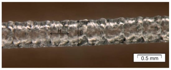 Micrograph of a string of droplets obtained using the initial printing conditions in Table 2. H values are from 0.22 to 0.25 mm and B values from 0.28 to 0.32 mm, giving a drop aspect ratio (DAR = B/H) of approximately 1.26.