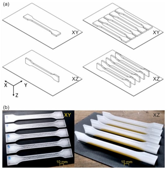 (a) Schematic representation of different orientations (XY or XZ) and arrangements (single or multiple) of tensile bars during printing, and (b) examples of printed parts without support material and with support material (yellowish material).