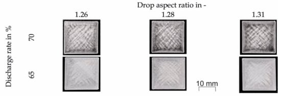 As a final step, the discharge rate was varied from 65 to 68% in increments of 1% to obtain better adhesion between droplets and layers. Figure 7 shows the resulting cubes at three different discharge values (65%, 66% and 67%). It has to be mentioned that a discharge value of 68% was not possible due to an axis error during the build job. Thus, 67% was set as the discharge value. The specimen processed with DAR = 1.29 had the best appearance with an even color and the best evenness.
